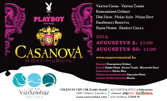 ( ! ) Warning: Invalid argument supplied for foreach() in /home/viziszinhaz.com/public_html/wp-content/themes/K-BOOM-v.1.1.2/archive.php on line 27 Call Stack # Time Memory Function Location 1 0.0013 105432 {main}( ) ../index.php:0 2 0.0022 111072 require( '/home/viziszinhaz.com/public_html/wp-blog-header.php' ) ../index.php:17 3 0.8679 40278304 require_once( '/home/viziszinhaz.com/public_html/wp-includes/template-loader.php' ) ../wp-blog-header.php:16 4 0.8739 40351064 include( '/home/viziszinhaz.com/public_html/wp-content/themes/K-BOOM-v.1.1.2/archive.php' ) ../template-loader.php:74 Az ismert velencei kalandor nőkhöz fűződő történetét zenés produkció keretein belül tekintheti meg az érdeklődő közönség. A fülbemászó zene, a káprázatos látvány és a lendületes koreográfiák remek hangulatot varázsolnak a színpadra. Vastag Csaba, mint Casanova jelenik meg a darabban, a Kölyök szerepében testvére, Vastag Tamás látható. Casanova szeretői: Dér Heni, Nyári Alíz, Nyári Edit,...